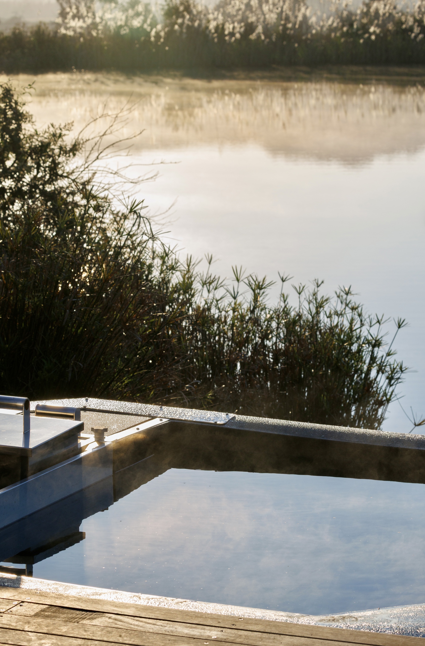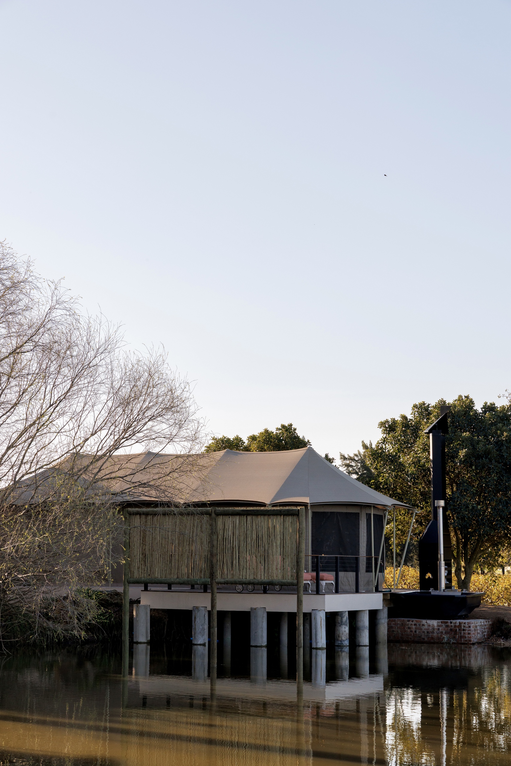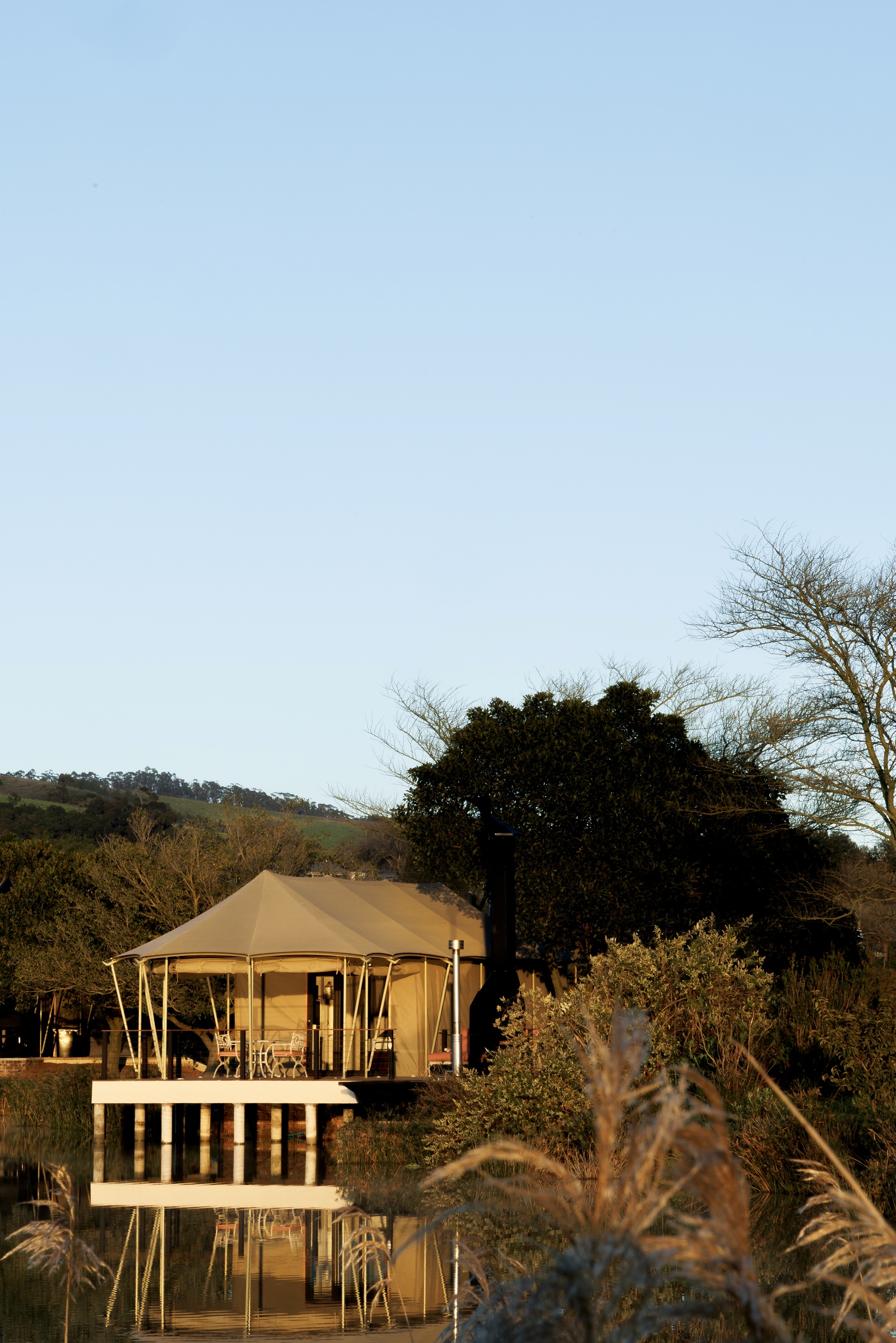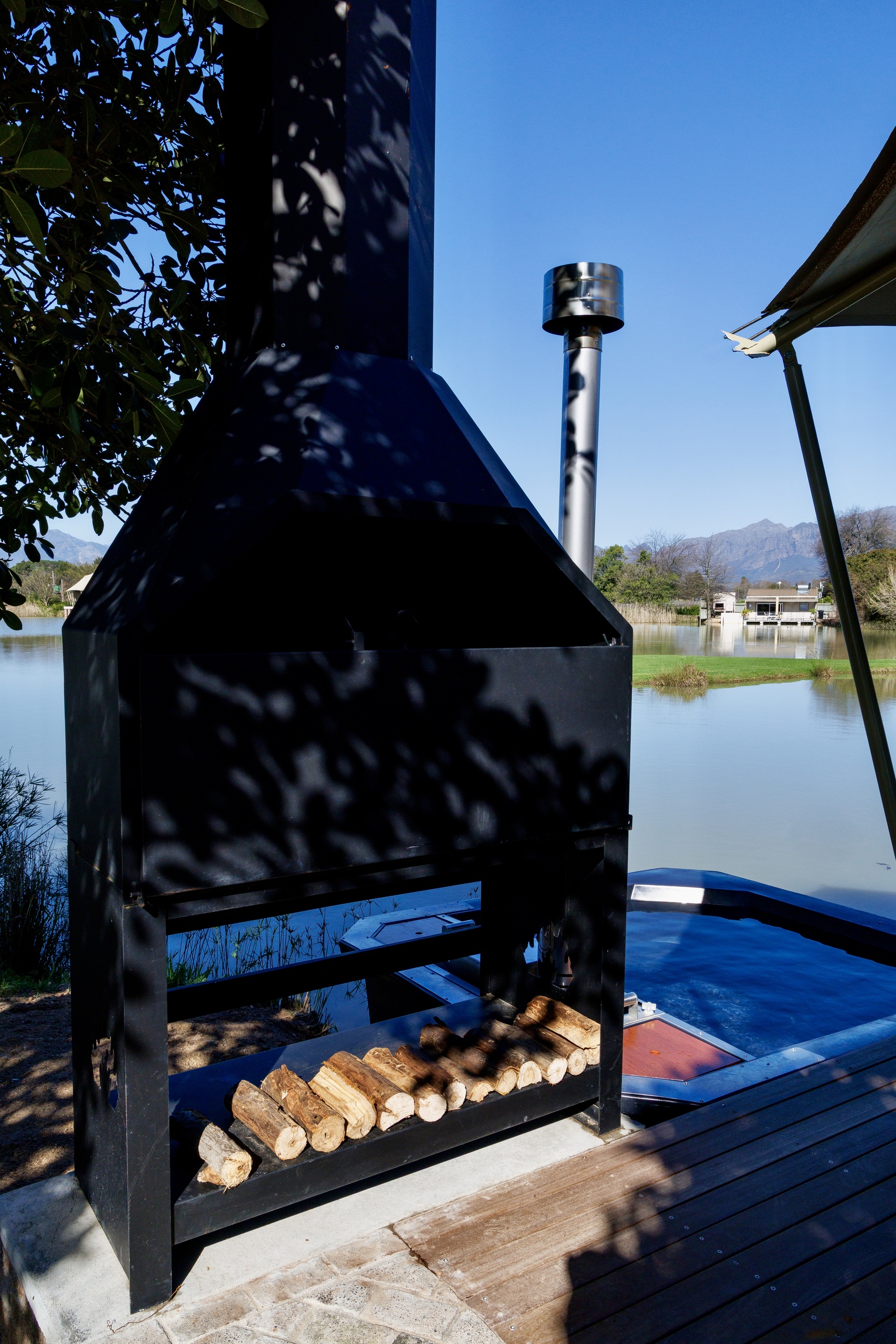 Sunlight streams through generous windows, blurring the line between indoors and outdoors, while your private deck opens to sweeping views of the lake. From quiet mornings with coffee in hand to starlit soaks in the wood-fired hot tub, every detail invites you to pause, breathe, and connect with the beauty of the Cape Winelands.