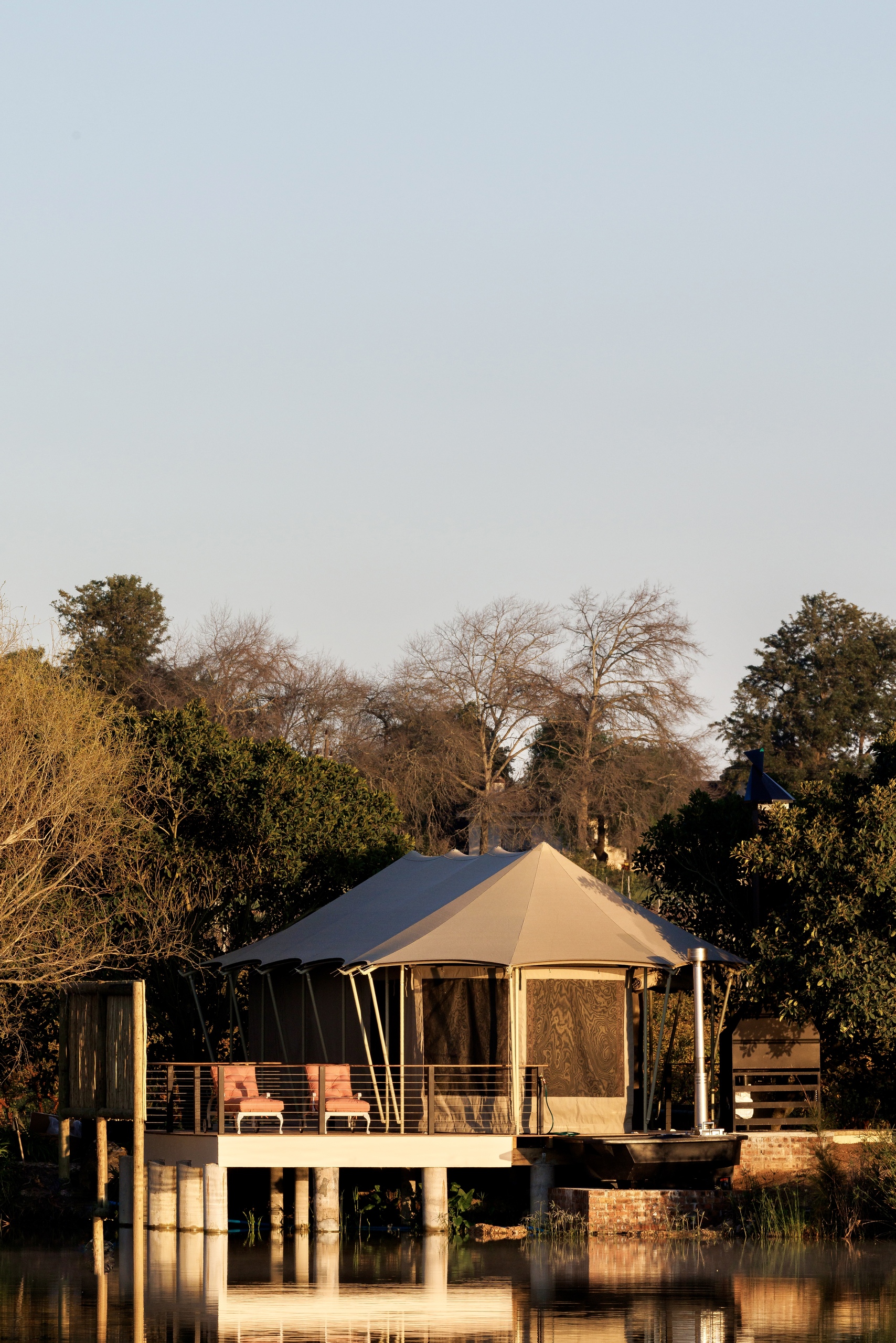 Luxurious self-catering glamping tent in the winelands, featuring a private wood-fired hot tub, plush interiors, and stunning mountain views the perfect blend of comfort and nature.