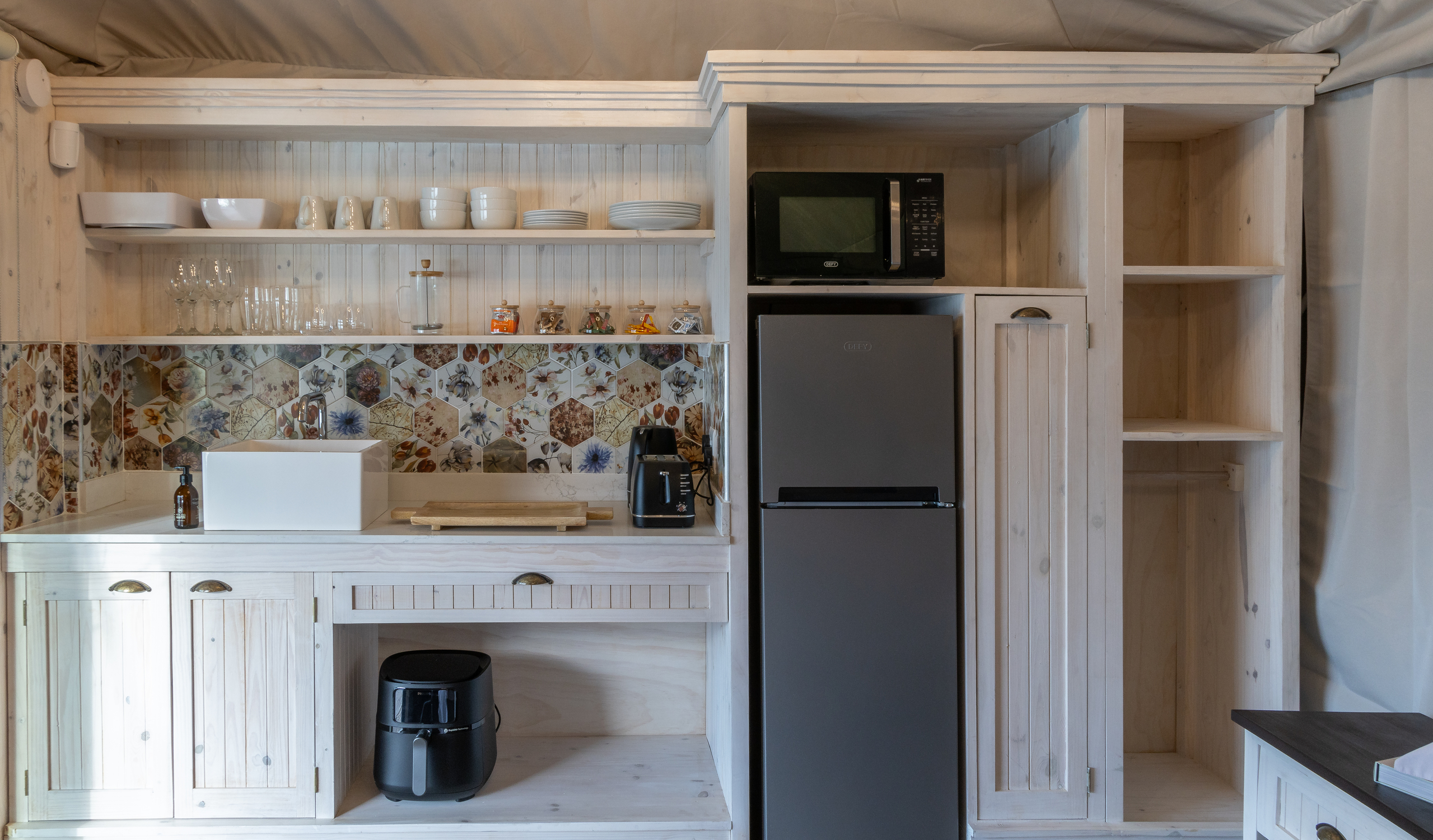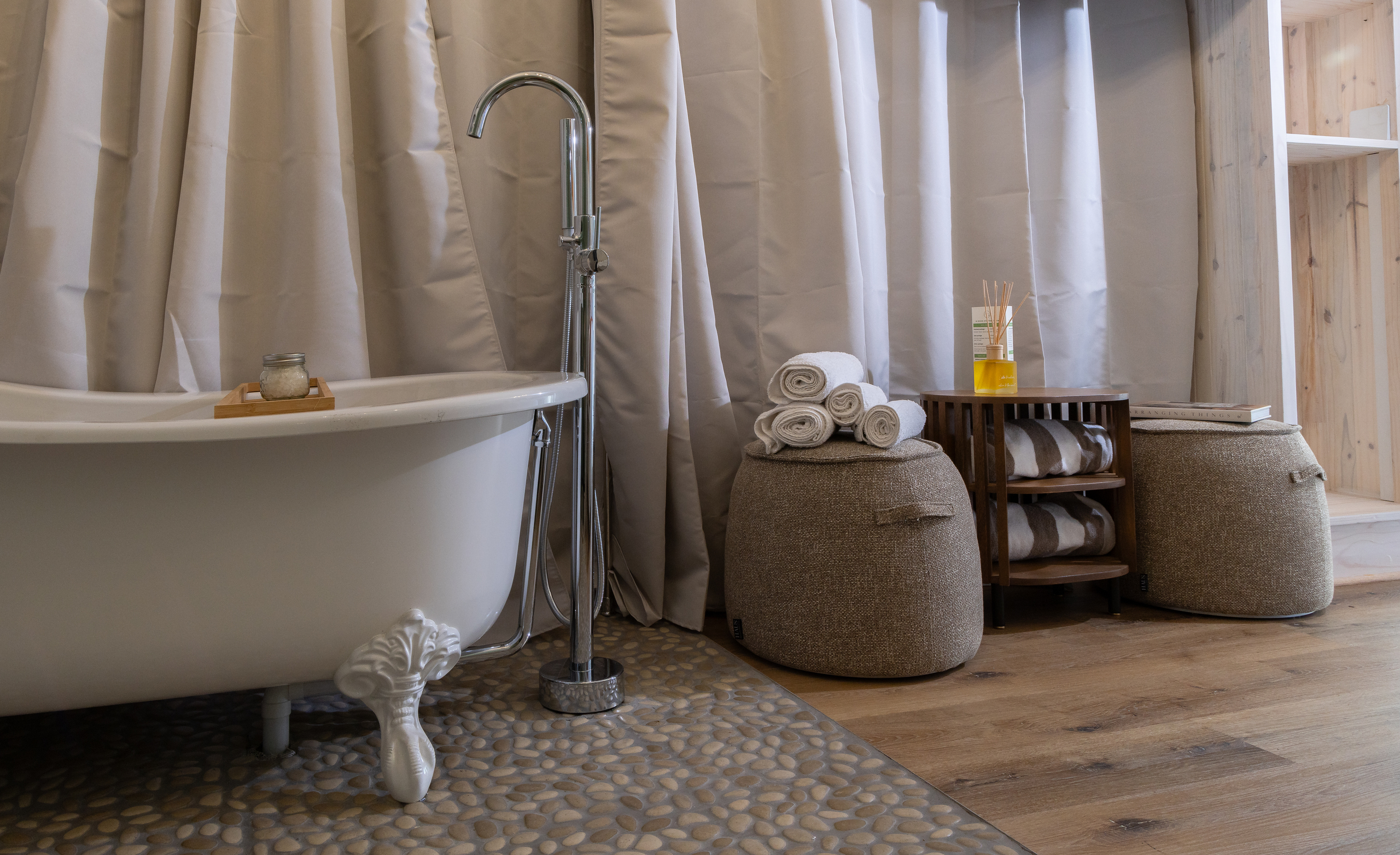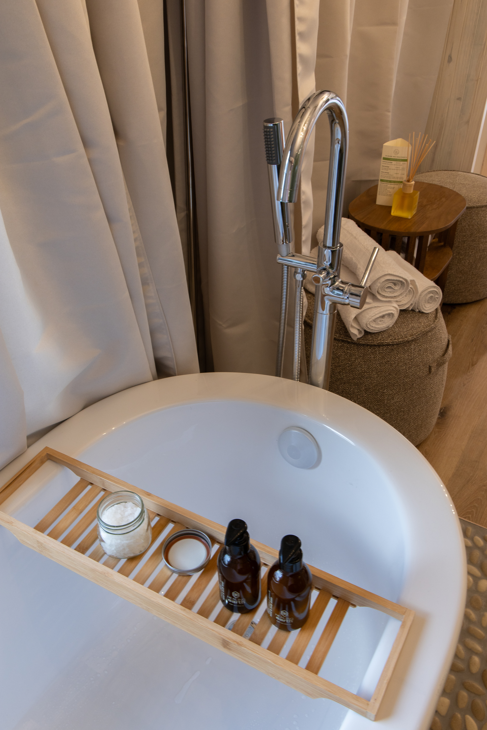 Escape to this serene glamping tent with a plush bed, chic decor, and private wood-fired hot tub—perfect for relaxing under the stars and connecting with nature.