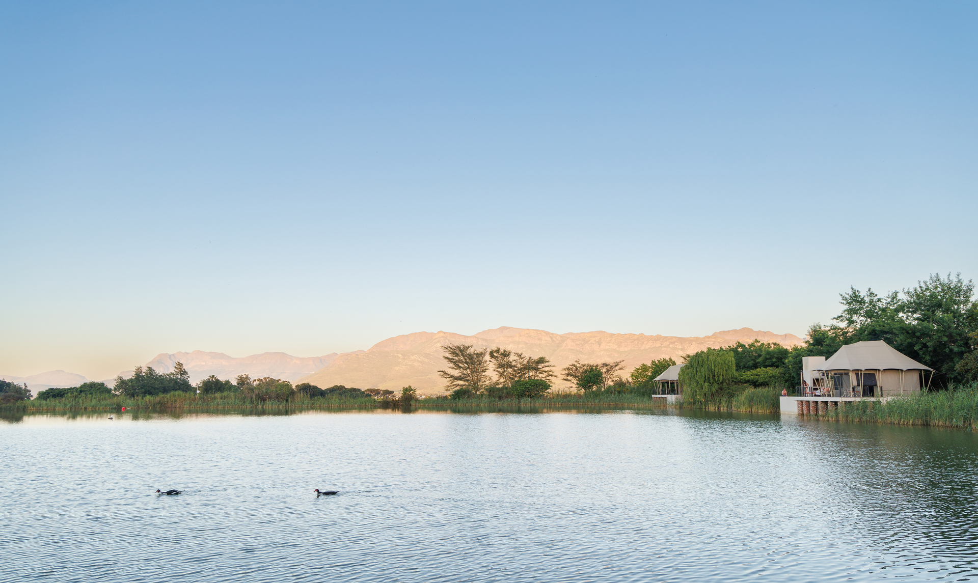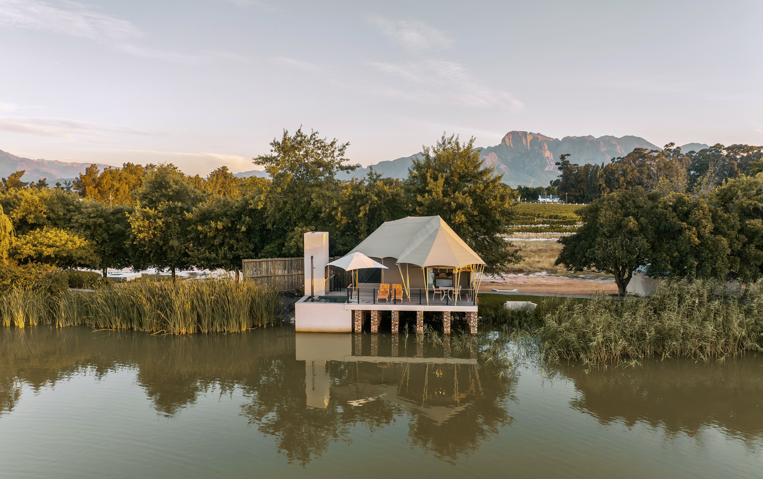 Large windows and open spaces fill the tent with natural light, creating a seamless connection with the stunning surroundings. Wake up to breathtaking lake views, unwind on your private deck, and immerse yourself in the peace and tranquillity of the Cape Winelands.