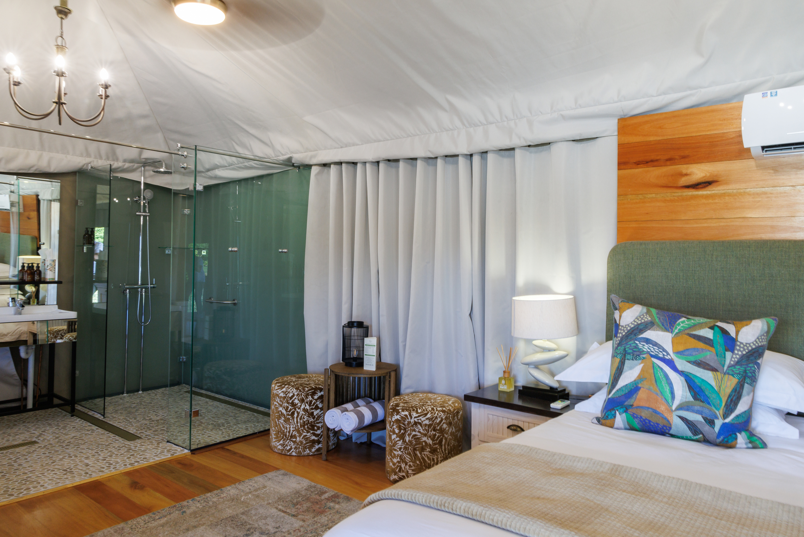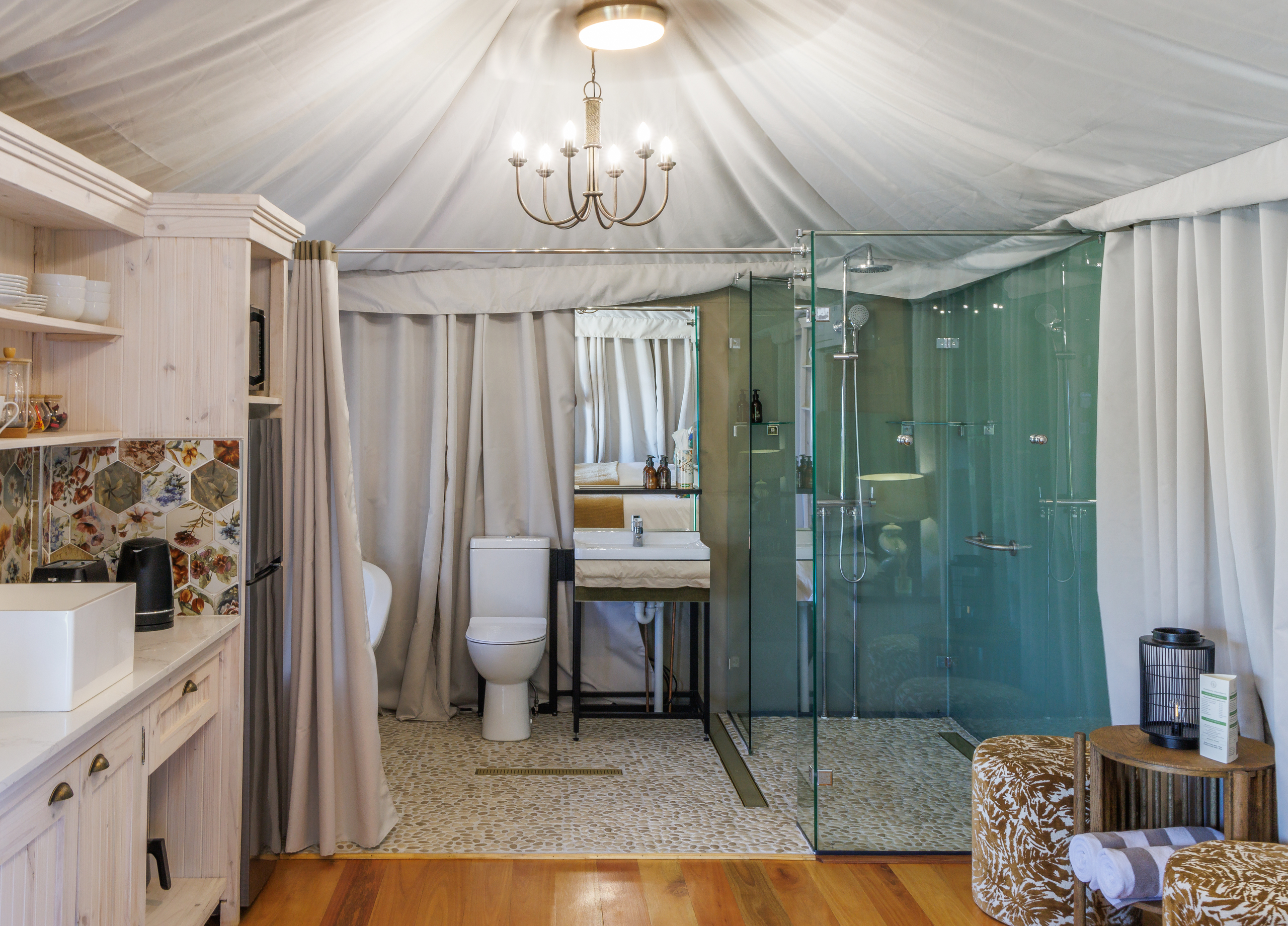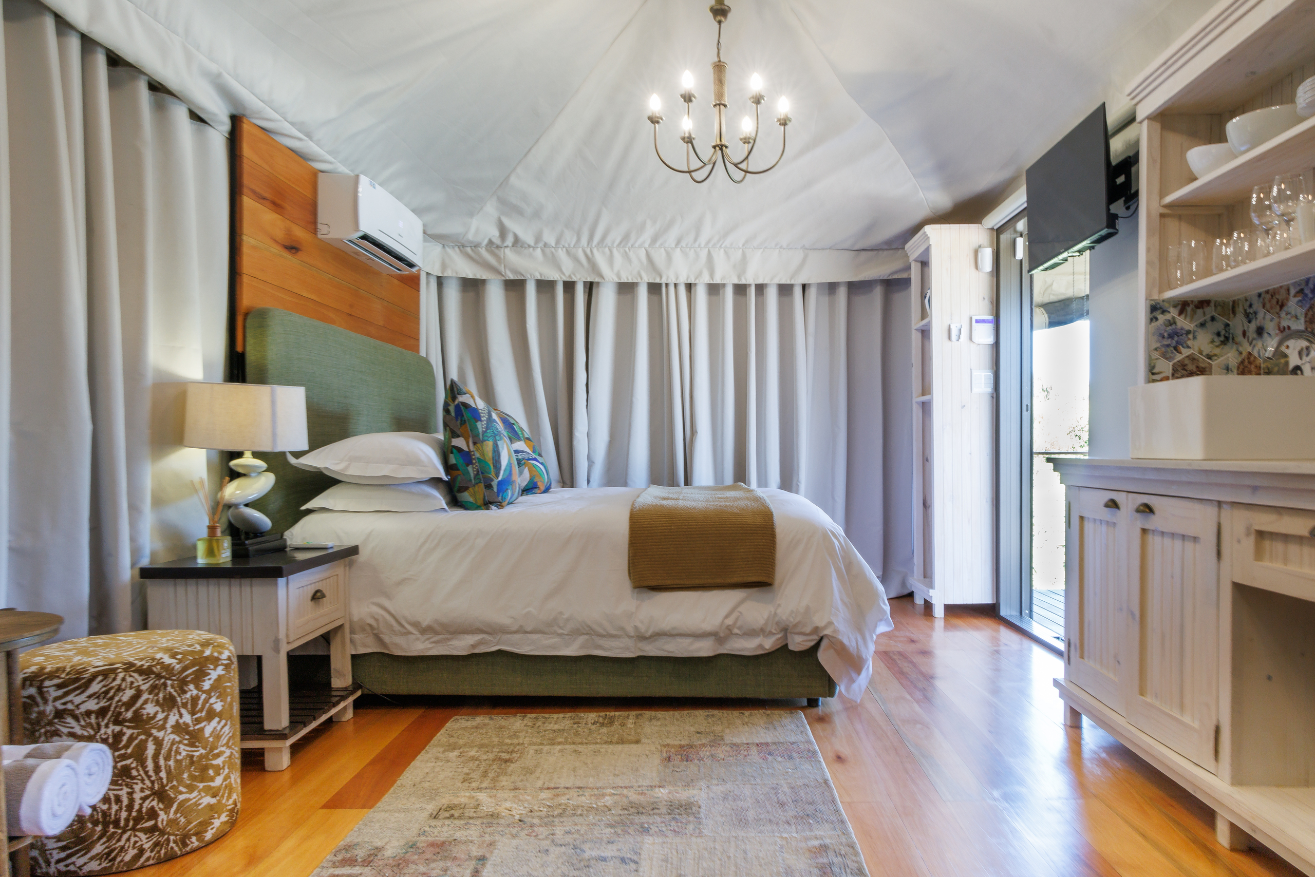 Designed for comfort and relaxation, the Chenin tent offers a warm and inviting escape in the heart of nature. Featuring a plush super king bed, tasteful decor, and essential amenities, this thoughtfully curated space ensures a restful and rejuvenating stay.