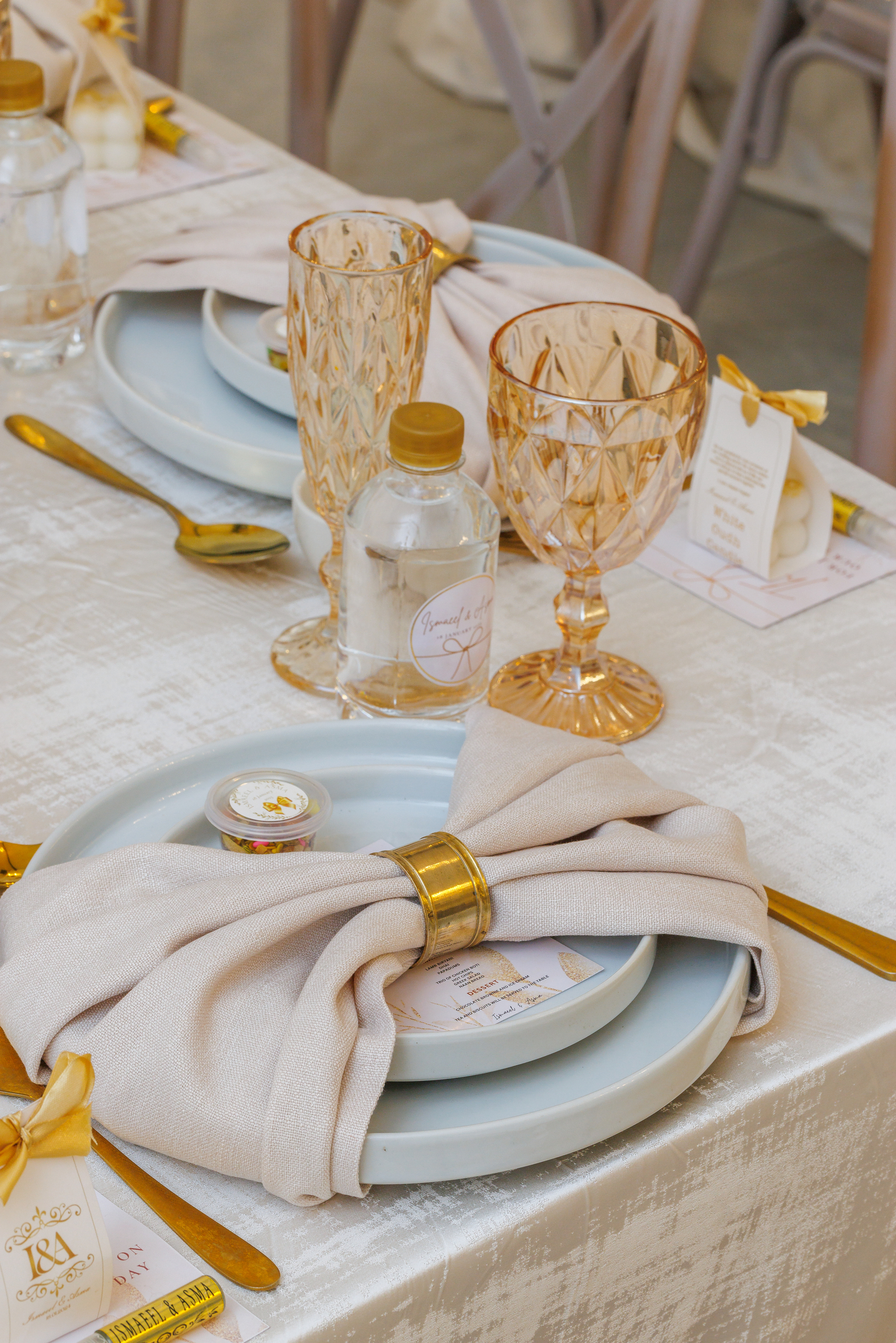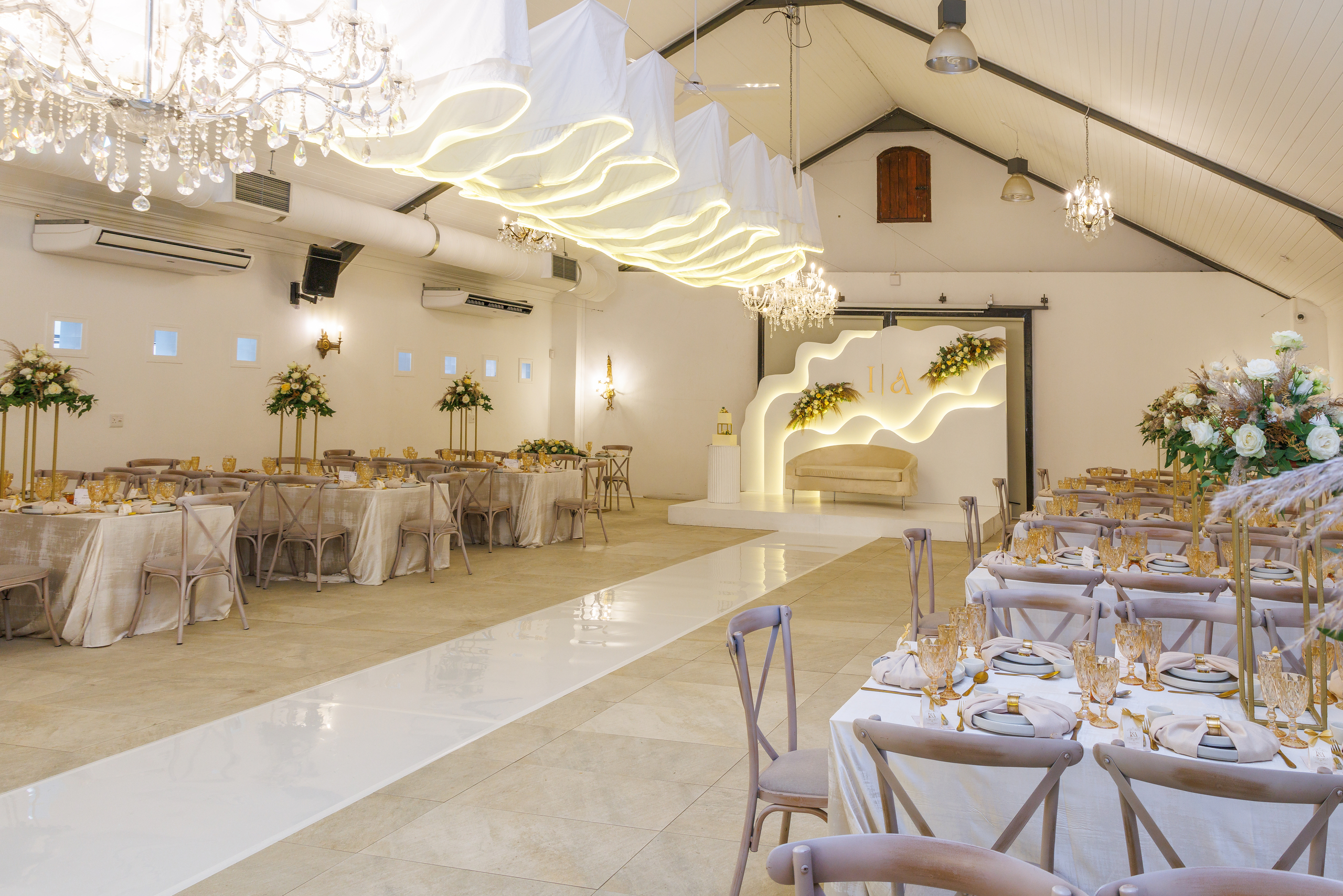 Set in our Classic yet sophisticated hall, the couple chose a classic gold and cream color palette, exuding timeless elegance. Every detail, from the exquisite floral arrangements to the chic table settings, reflected the couple’s refined taste. The glowing chandeliers, delicate drapery, and modern wave-inspired backdrop created a stunning ambiance, making their special day truly magical.