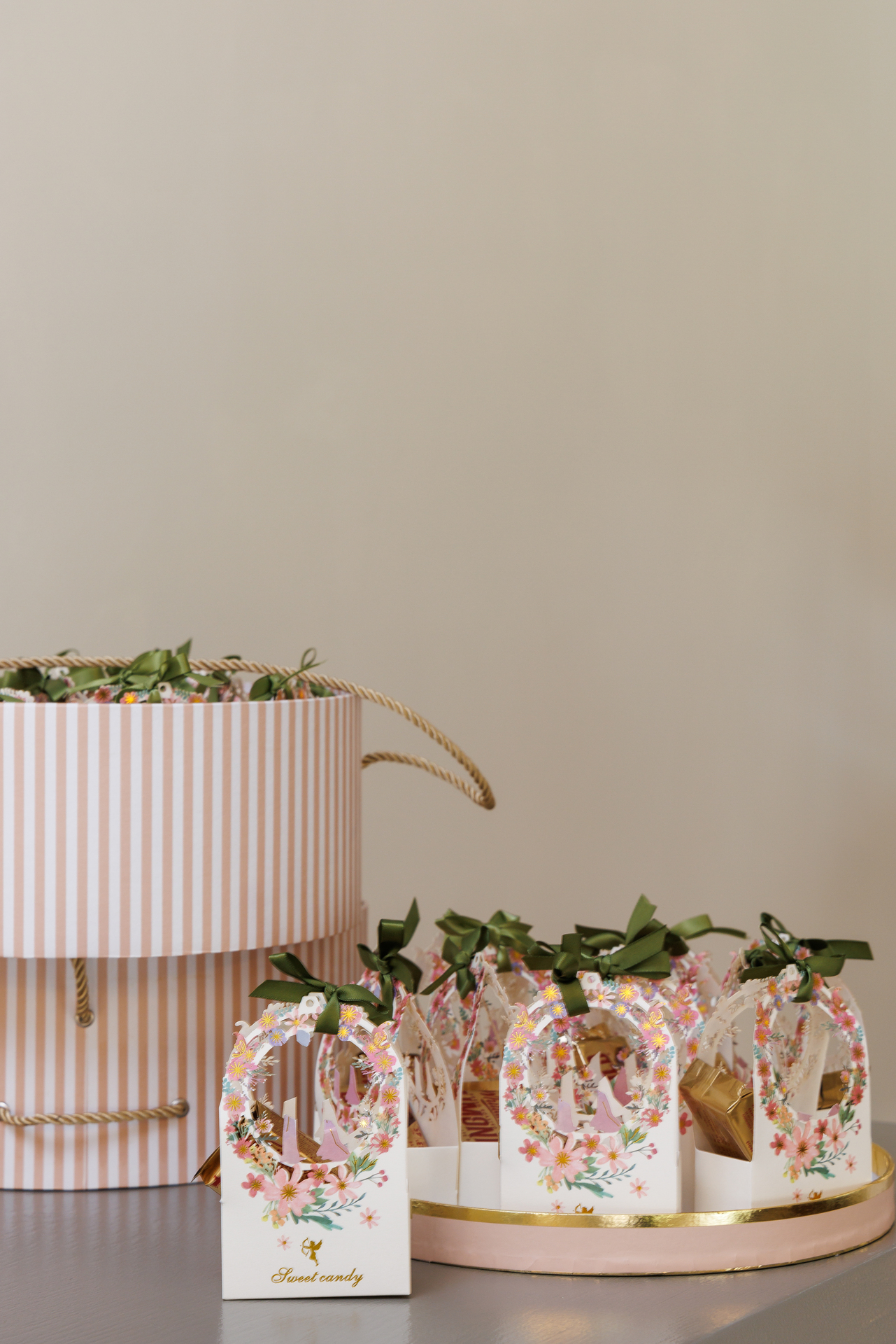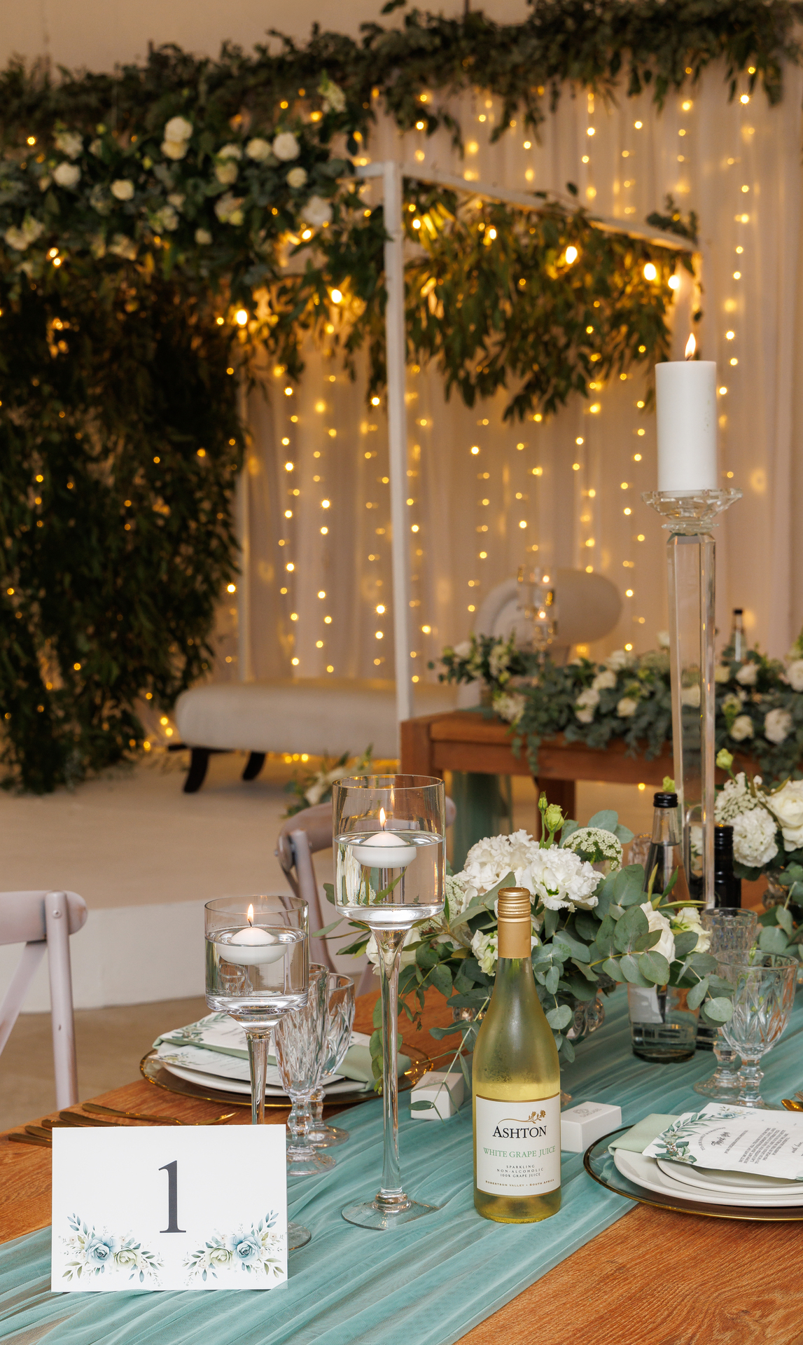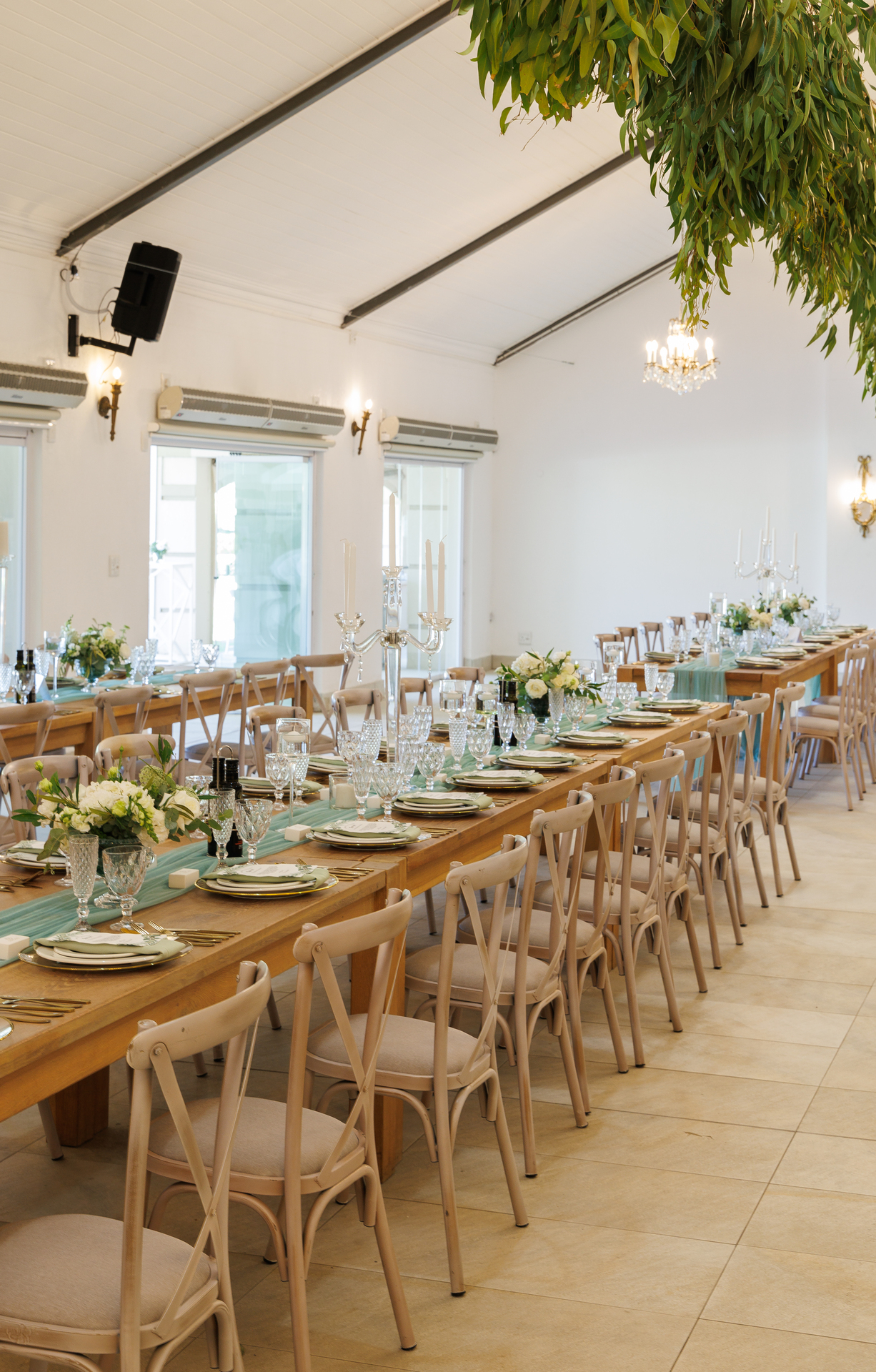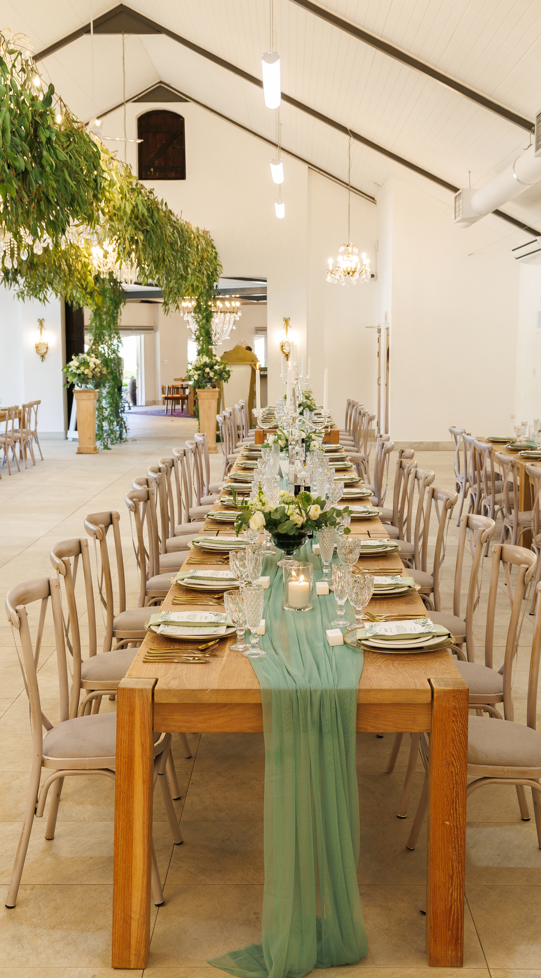 The Classic Hall was adorned with long wooden banquet tables, creating an intimate yet grand dining experience. Instead of traditional round tables, these long tables were beautifully lined with sage-colored table runners, adding a soft, natural elegance to the space. White and gold tableware complemented the theme, while crystal glassware reflected the glow of the dazzling chandeliers above.