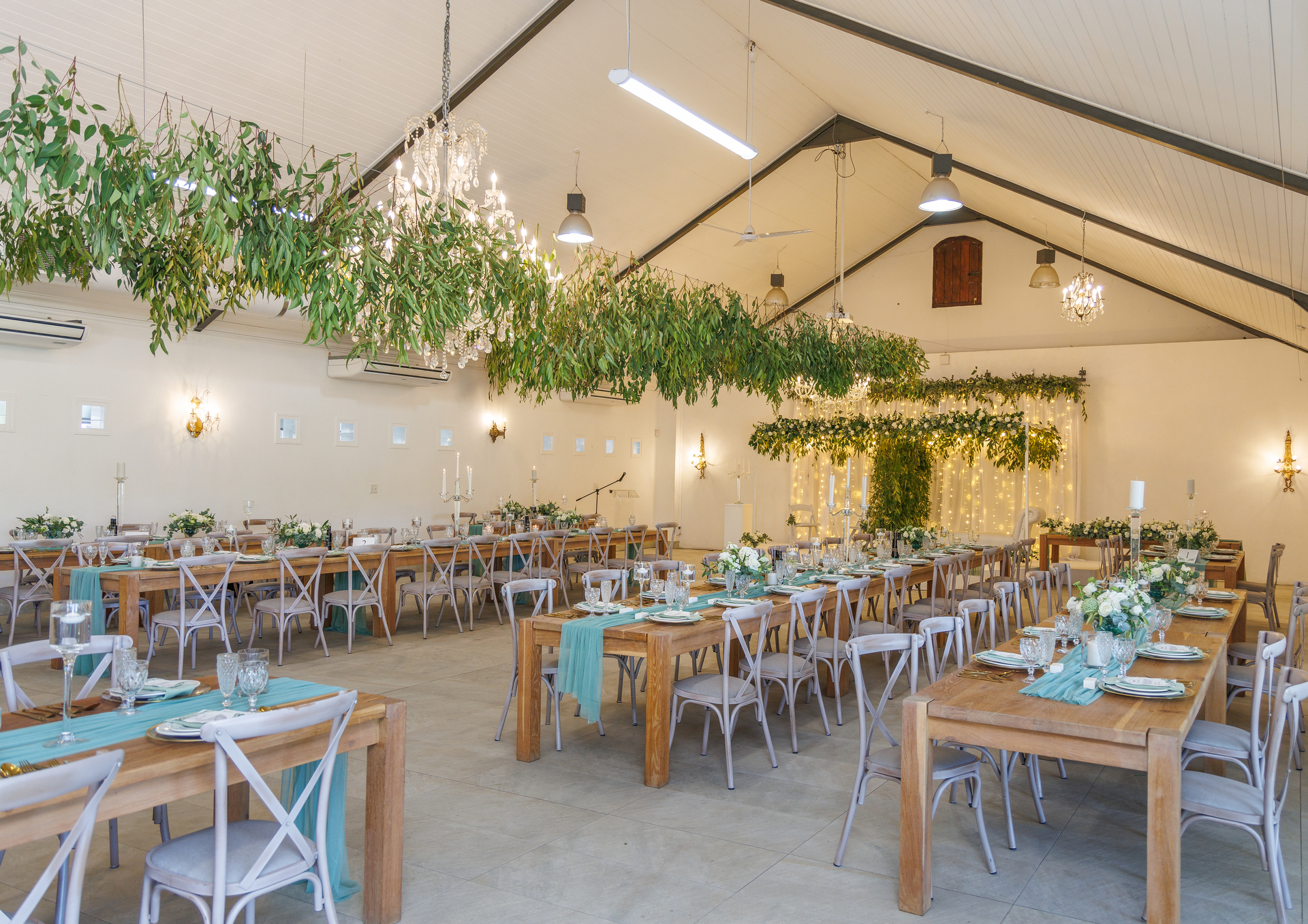 Overhead, lush greenery cascaded from the sparkling chandeliers, enhancing the romantic atmosphere. At the front of the room, a stunning stage draped with fairy lights and greenery created a dreamy focal point, where the couple enjoyed heartfelt toasts and shared their first moments as newlyweds.