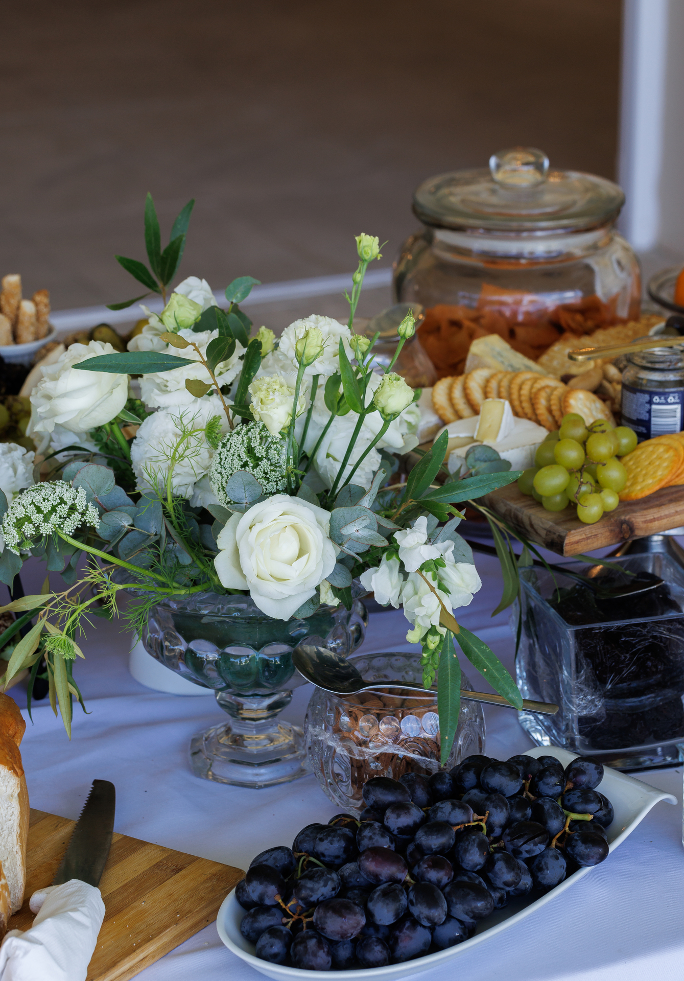 Elegante Catering ensured that guests were treated to a delightful culinary experience. A beautifully arranged snack table greeted guests upon arrival, featuring a variety of cheeses, preserves, olives, and fresh fruits—a perfect way to indulge before the main feast began.